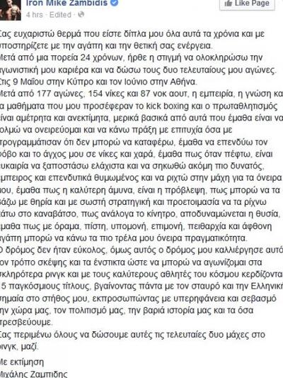 Μια δυσάρεστη έκπληξη επεφύλασσε ο Μιχάλης Ζαμπίδης το πρωί της Πρωτομαγιάς. Μέσω του επίσημου λογαριασμού του στο facebook ανακοίνωσε ότι αποφάσισε να βάλει τέλος στην αγωνιστική του καριέρα. Όπως ήταν φυσικό, χιλιάδες διαδικτυακοί του φίλοι του ευχήθηκαν τα καλύτερα και τόνισαν γι’ ακόμα μια φορά πόσο υπερήφανους έχει κάνει κατά καιρούς τους Έλληνες.