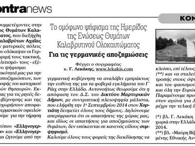 Στο μεταξύ σε χθεσινό δημοσίευμα της Kontranews, ο δημοσιογράφος και συγγραφέας Γιώργος Λεκάκης που έχει ασχοληθεί σε βάθος με το θέμα των Γερμανικών λεηλασιών και καταστροφών την περίοδο της Κατοχής στην Ελλάδα, ο οποίος έχει έρθει και έχει μιλήσει για το θέμα και στην Πάτρα, παρουσίασε το Ομόφωνο Ψήφισμα της Ημερίδας των Καλαβρύτων για τις Γερμανικές αποζημιώσεις.