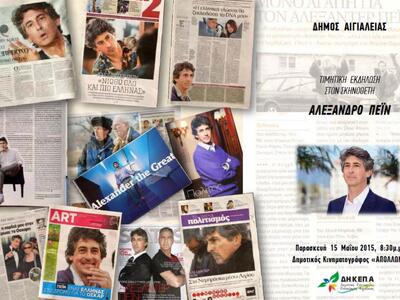 Μεγάλη είναι η κινητοποίηση ενόψει του ερχομού του Ελληνικής καταγωγής από την Αιγιάλεια 54χρονου, βραβευμένου με Όσκαρ σεναριογράφου και σκηνοθέτη Αλεξάντερ Πέιν στο Αίγιο την Παρασκευή 15 Μαίου 2015. Όπως αναφέρεται στο σχετικό δελτίο Τύπου, το Αίγιο με μεγάλη υπερηφάνεια, θα υποδεχθεί τον Αιγιώτη στην καταγωγή και βραβευμένο με Όσκαρ Αλέξανδρο Πέιν, που θα βρεθεί στην πόλη ως επίσημος προσκεκλημένος σε ειδική τιμητική εκδήλωση που διοργανώνει η Δημοτική Κοινωφελής Επιχείρηση Αιγιαλείας (ΔΗ.Κ.ΕΠ.Α.) στον Δημοτικό Κινηματογράφο “Απόλλωνα”.