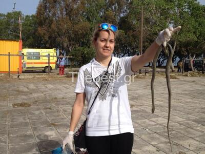Τελικά εργαζόμενοι σκότωσαν το φίδι και συνέχισαν τις εργασίες τους στο σημείο. Μια τολμηρή πατρινή μάλιστα, ποζάρει με το ερπετό. Ηταν η ίδια που νωρίτερα κατατρόμαξε στην θέα του. Πλέον όμως δεν αποτελεί απειλή.