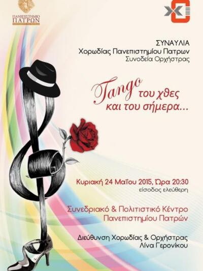 Ένα μουσικό ταξίδι από τα τάνγκο του χθες στα τάνγκο του σήμερα, όπως είναι και ο τίτλος της μουσικής βραδιάς, θα παρουσιάσει η Χορωδία του Πανεπιστημίου Πατρών αυτή την Κυριακή 24 Μαΐου 2015 στις 20.30 το βράδυ στο Συνεδριακό και Πολιτιστικό Κέντρο του Πανεπιστημίου στο Ρίο.