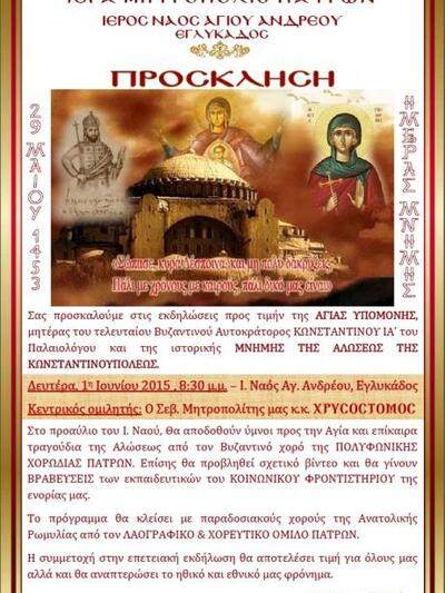 Ο ιερός ναός του Αγ. Ανδρέου Εγλυκάδος προσκαλεί το κοινό στις εκδηλώσεις που θα γίνουν προς τιμή της Αγίας Υπομονής, μητέρας του τελευταίου Βυζαντινού Αυτοκράτορος Κωνσταντίνου ΙΑ’ Παλαιολόγου και της ιστορικής μνήμης της Αλώσεως της Κωνσταντινούπολης (29 Μαίου 1453).