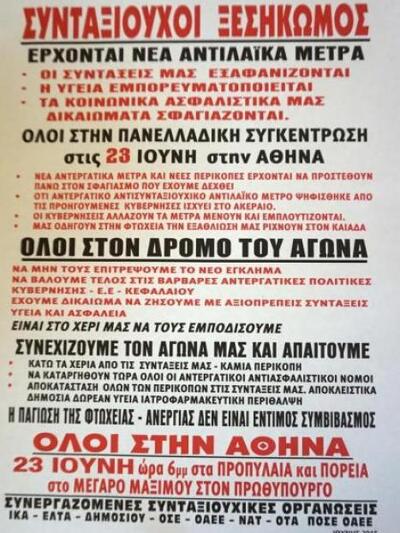 Οι εξορμήσεις από τα συνταξιουχικα σωματεία θα συνεχιστούν για την οργάνωση της συμμετοχής των συνταξιούχων με πούλμαν στο Πανελλαδικό Συλλαλητήριο στις 23 Ιούνη στην Αθήνα, στα Προπύλαια.