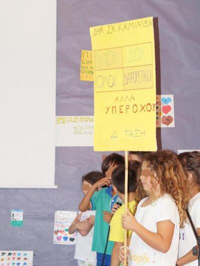 Οι μαθητές της Δ' Τάξης παρουσίασαν εκπαιδευτικά προγράμματα για την ενδυμασία στην αρχαία Ελλάδα καθώς επίσης και για την  Διαφορετικότητα. Στα πλαίσια της παρουσίασης του προγράμματος για την Διαφορετικότητα υλοποίησαν θεατρικό δρώμενο με θέμα το πολύ επίκαιρο πρόβλημα του σχολικού εκφοβισμού (BULLYING)  με την καθοδήγηση της δασκάλας τους, κας. Άννας Μπιλάλη, και την βοήθεια του διευθυντή του Δημοτικού κ. Δημήτρη Τάσιου.