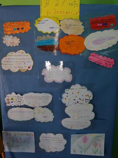 Οι μαθητές της Ε' Τάξης και η δασκάλα τους κα. Μαρία Γκοβίλα, παρουσίασαν περιβαλλοντικό πρόγραμμα αφιερωμένο στο Νερό. Επίσης παρουσίασαν εκπαιδευτικό πρόγραμμα για την καθημερινή ζωή σε μια από τις σημαντικότερες περιόδους του Ελληνισμού, την Βυζαντινή. Στα πλαίσια αυτού του προγράμματος κατασκεύασαν όμορφα αντικείμενα από πηλό, όπως πιάτα, αγγεία, κουτάλια κ.α., όμοια με αυτά που χρησιμοποιούσαν καθημερινά οι κάτοικοι της Βυζαντινής Αυτοκρατορίας.