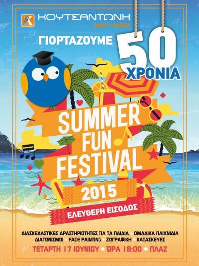 Το Summer Fun Festival φέτος, πιο "ζωντανό", πιο διασκεδαστικό και πιο εορταστικό από ποτέ -μιας και φέτος τα Κ.Ξ.Γ. Κουτσαντώνη συμπληρώνουν 50 χρόνια επιτυχημένης πορείας -θα πραγματοποιηθεί στην Πλαζ του ΕΟΤ, αυτή την Τετάρτη 17 Ιουνίου και η είσοδος είναι ελεύθερη για όλους!