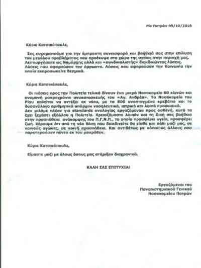 Ευχαριστήρια επιστολή, έστειλαν σήμερα στον υποψήφιο Δήμαρχο Πατρέων κ. Δημήτρη Κατσικόπουλο οι εργαζομένοι του Νοσοκομείου Ρίου, με αφορμή την πρωινή του επίσκεψη εκεί. Δείτε την επιστολή.