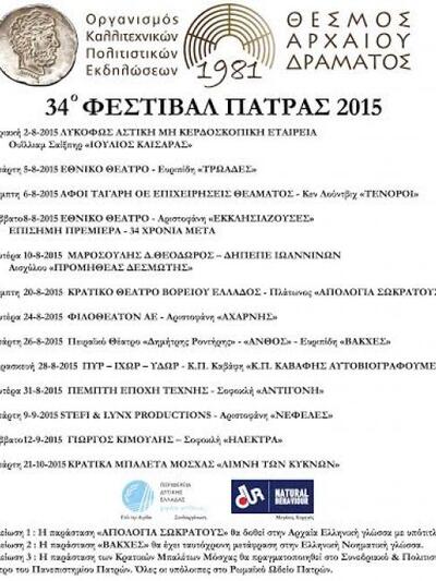 Ακολουθεί αναλυτικά το πρόγραμμα εκδηλώσεων του 34ου Φεστιβάλ Πάτρας 2015 – Θεσμός Αρχαίου Δράματος