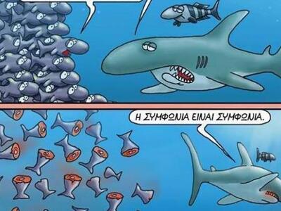 Θραύση κάνει στο facebook ένα παλαιότερο αλλά επίκαιρο όσο ποτέ σκίτσο του γνωστού σκιτσογράφου Αρκά που έχει πάρει μεγάλες διαστάσεις στα πλαίσια του επικείμενου δημοψηφίσματος και της επιλογής που καλούμαστε να κάνουμε ανάμεσα στο «ναι» ή το «όχι» για την νέα ‘’συμφωνία’’ που ‘’προτείνεται’’ από τους δανειστές. Ο καρχαρίας του Αρκά έχει ήδη αποφασίσει να φάει όλα τα ψάρια ωστόσο προτείνει και αυτός μια συμφωνία. Στο τέλος το μέλλον των ψαριών τραγικό αλλά και σύμφωνο με την Συμφωνία!