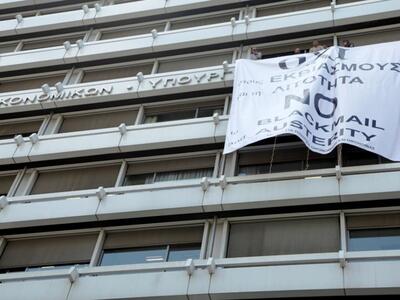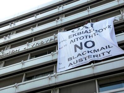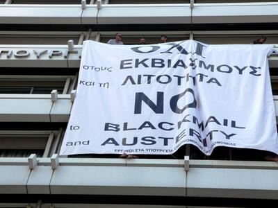 Το πανό γράφει στα ελληνικά και στα αγγλικά «Όχι στους εκβιασμούς και τη λιτότητα» και καλύπτει δύο ορόφους του κτιρίου, ενώ υπογράφεται από υπαλλήλους του υπουργείου Οικονομικών και Οικονομίας.