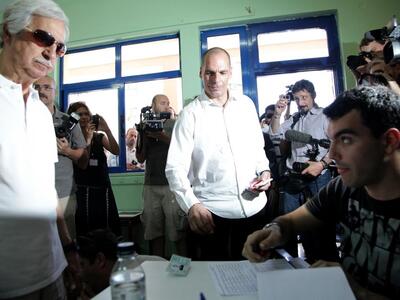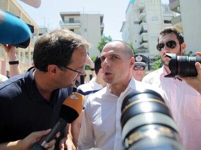 Με την άφιξη του Γιάνη Βαρουφάκη στο 2ο δημοτικό σχολείο του Παλαιού Φαλήρου επικράτησε πανδαιμόνιο από τα τηλεοπτικά συνεργεία και τους δημοσιογράφους που βρέθηκαν από νωρίς στο εκλογικό κέντρο.Ο υπουργός Οικονομικών έκανε την εμφάνισή του, μαζί με τον πατέρα του, λίγο μετά τις 12.00 και ανέβηκε στην αίθουσα.