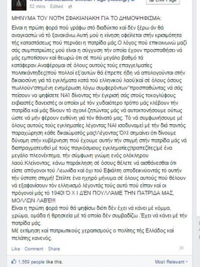 Δεν είναι λίγες οι φορές που ο Νότης Σφακιανάκης έχει σχολιάσει πολιτικές και κοινωνικές εξελίξεις.Αυτή την φορά σχολίασε το δημοψηφισμα μέσω facebook.