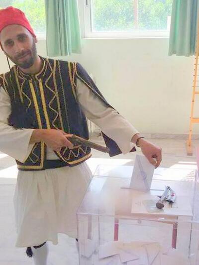 "Ελληνοφρένεια"...τώρα και στο Αίγιο και μάλιστα πάνω απ'την κάλπη! Ο τσολιάς της φωτογραφίας δεν είναι άλλος από τον νεαρό αιγιώτη Άγγελο Δούκα, ο οποίος ντύθηκε με την παραδοσιακή φουστανέλα και πήγε σήμερα το πρωί στο εκλογικό του τμήμα για να ψηφίσει.