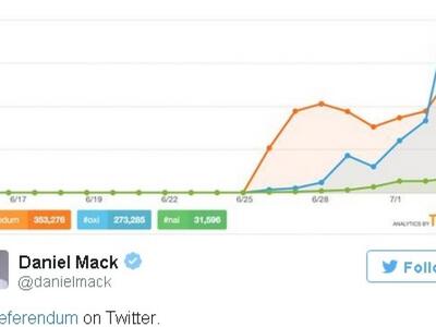 Ένα γράφημα που δείχνει ποια hashtag χρησιμοποιήθηκαν περισσότερο στο twitter μέχρι να κλείσουν οι κάλπες. Το #Greferendum χρησιμοποιήθηκε 353.276 φορές, το #oxi 273.285 φορές και το #nai 31.596 φορές.