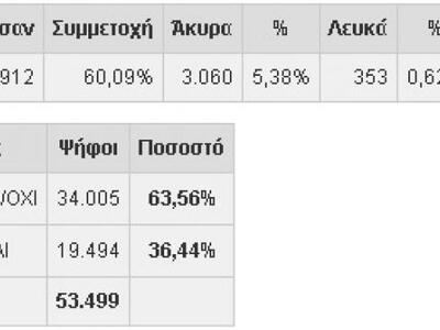 Δείτε το ανεπίσημο τελικό αποτέλεσμα στον δήμο Αγρινίου, στα 181 εκλογικά τμήματα. Η συμμετοχή έφθασε το 60,09% καθώς ψήφισαν 56.912 από τους 94.716 εγγεγραμμένους. Το ΟΧΙ έλαβε 63,56% και το ΝΑΙ 36,44%.