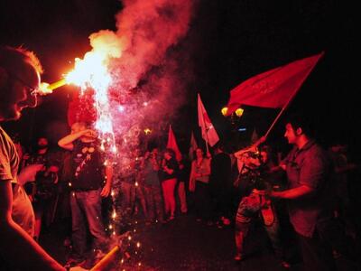 Μετά την ανακοίνωση των πρώτων αποτελεσμάτων και την ξεκάθαρη επικράτηση του «όχι» στήθηκε τρικούβερτο γλέντι με μουσική και πολύ χορό με τους παρευρισκομένους να γίνονται μια μεγάλη παρέα.