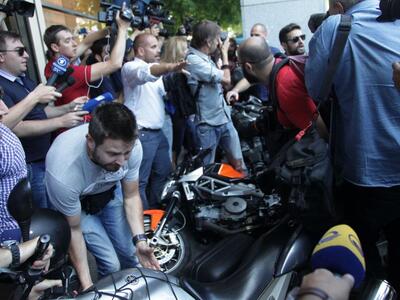 Ο ίδιος αποχώρησε μετά τις δηλώσεις με την αγαπημένη του μηχανή και τη σύζυγό του Δανάη Στράτου να επιβιβάζεται επίσης στο δίκυκλο κρατώντας σφιχτά αγκαλιά τον σύντροφό της.
