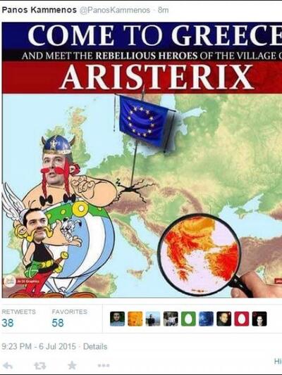 "Ελάτε στην Ελλάδα και συναντήστε τους ανυπότακτους ήρωες του χωριού του Αριστερίξ" αναγράφεται στη γελοιογραφία με τον κ. Τσίπρα να εμφανίζεται ως Αστερίξ και ο κ. Καμμένος ως Οβελίξ.