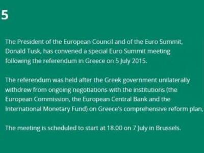 Δημοσιοποιήθηκε η αναγγελία του Εurogroup και της Συνόδου για την Ελλάδα στην ιστοσελίδα της Κομισιόν. Το θέμα όπως περιγράφεται είναι «Η κατάσταση μετά το δημοψήφισμα στην Ελλάδα» και στη Σύνοδο μετέχουν οι 19 ηγέτες των χωρών της ζώνης του ευρώ.