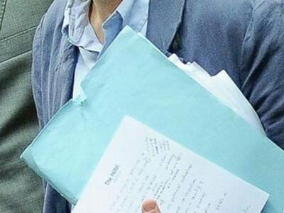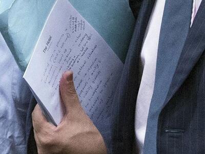 Οι φωτογράφοι δεν έχασαν λοιπόν την ευκαιρία να κάνουν...ζουμ στο χαρτί στο οποίο ο Υπουργός είχε σημειώσει τις σκέψεις του στα αγγλικά.