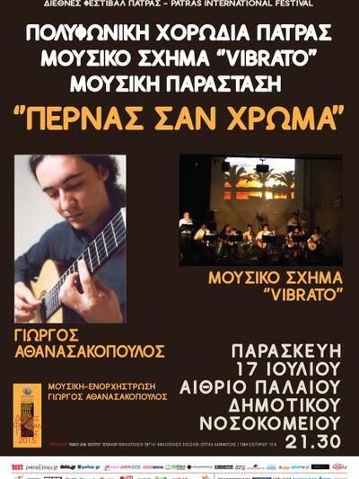 Με εντατικές δοκιμές συνεχίζεται η προετοιμασία για τη συναυλία του μουσικού σχήματος ‘’VIBRATO’’ της ΠΟΛΥΦΩΝΙΚΗΣ [Διεύθυνση: Γιώργος Αθανασαλόπουλος], που θα πραγματοποιηθεί την Παρασκευή 17 Ιουλίου, στο αίθριο του Παλαιού Δημοτικού Νοσοκομείου, στο πλαίσιο του Διεθνούς Φεστιβάλ Πάτρας, με το γενικό τίτλο: ‘’ Περνάς σαν χρώμα’’.