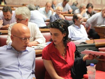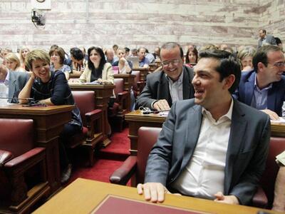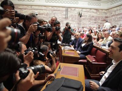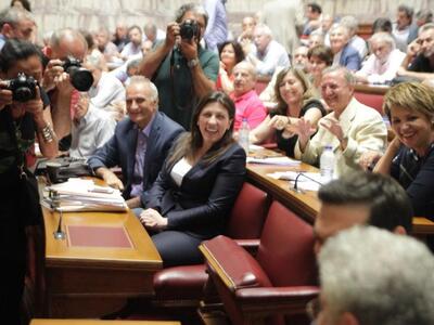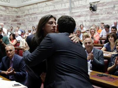 Στις φωτογραφίες, που ακολουθούν είναι φανερή η έκφραση χαράς της Ζωής Κωνσταντοπούλου την οποία ο Αλέξης Τσίπρας φίλησε πριν καθίσει στα έδρανα.