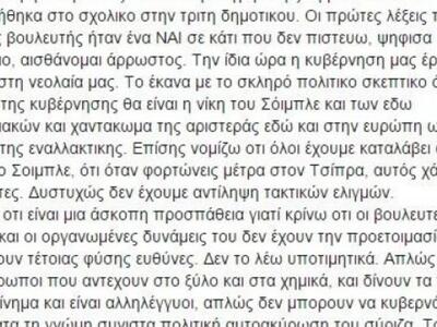 "Οι πρώτες λέξεις που είπα ως βουλευτής ήταν ένα ΝΑΙ σε κάτι που δεν πιστεύω, ψήφισα μνημόνιο, αισθάνομαι άρρωστος. Την ίδια ώρα η κυβέρνηση μας έριχνε χημικά στη νεολαία μας", γράφει ο Γιώργος Κυρίτσης και εξηγεί γιατί ψήφισε "Ναι" αφού πιστεύει όλα τα παραπάνω.