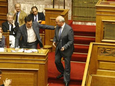 Ο Βαγγέλης Μεϊμαράκης κατεβαίνει από το βήμα και δέχεται το... "φιλικό" (;) χτύπημα στην πλάτη από τον Αλέξη Τσίπρα