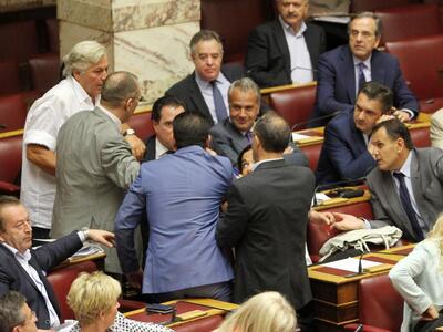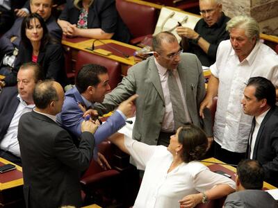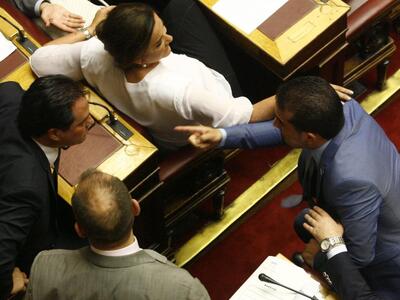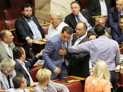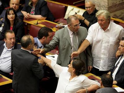 Η ένταση ήταν μεγάλη και μάλιστα ο βουλευτής των ΑΝΕΛ Χαρίσιος Κάτανας επιτέθηκε στον Άδωνι Γεωργιάδη με προφανή σκοπό να γίνει πολύ επιθετικός με τον βουλευτή της ΝΔ που καθόταν δίπλα στον Βορίδη και στην μπροστινή σειρά από τον Αντώνη Σαμαρά.