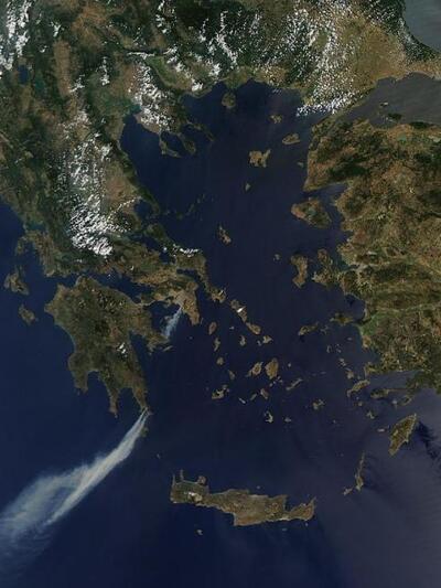 Χρήστης του Twitter «ανέβασε» στον λογαριασμό του την φωτογραφία πάνω από την Ελλάδα από τον δορυφόρο στην οποία φαίνονται καπνοί στην Αθήνα για την μεγάλη φωτιά στον Υμηττό και στη Λακωνία με τους ανέμους όπως φαίνεται να κατευθύνονται νότια.