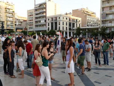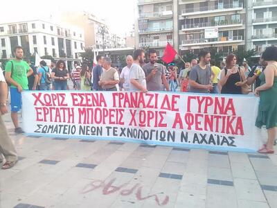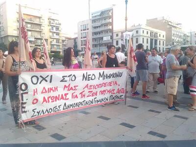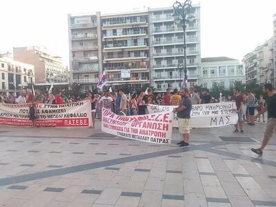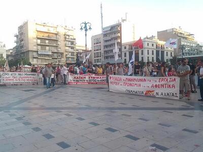 Συγκέντρωση στην πλατεία Γεωργίου της Πάτρας με πανό και συνθήματα πραγματοποίησαν από τις 8 το βράδυ σήμερα 22 Ιουλίου, μέλη του ΠΑΜΕ (Πανεργατικού Αγωνιστικού Μετώπου) και άλλων συλλογικοτήτων όπου κυριάρχησαν συνθήματα όπως «φτώχεια και μνημόνια για την εργατιά, κέρδη και προνόμια για τα αφεντικά» και «Αντιστεκόμαστε στην πολιτική που μας αφανίζει, την κρίση να πληρώσει το μεγάλο κεφάλαιο».