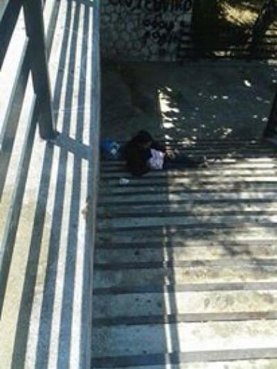 Μια εικόνα αθρώπινης εξαθλίωσης δίπλα μας, στην καρδιά της πόλης, σε ένα σημείο διέλευσης εκατοντάδων ανθρώπων. Ένας άνθρωπος με πασίδηλη ψυχική διαταραχή, αφημένος στην τύχη του, με στέγαστρο τον καύσωνα και την αδιαφορία.