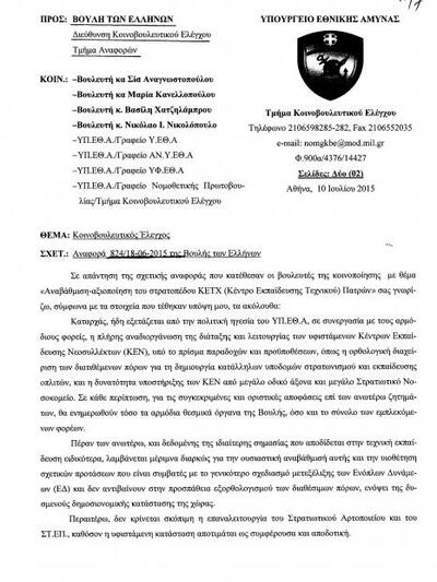 Ο κ. Τόσκας μεταξύ άλλων ανέφερε στην απάντηση του με ημερομηνία 10 Ιουλίου 2015 ότι εξετάζεται πλήρως η αναδιοργάνωση της διάταξης και λειτουργίας των υφισταμένων Κέντρων εκπαίδευσης Νεοσυλλέκτων και πως για την τεχνική εκπαίδευση ειδικότερα, λαμβάνεται μέριμνα διαρκώς για την αναβάθμιση αυτής και την υιοθέτηση προτάσεων που να είναι συμβατές με τον σχεδιασμό μετεξέλιξης των Ενόπλων δυνάμεων και να μην αντιβαίνουν στην προσπάθεια εξορθολογισμού των διαθέσιμων πόρων ενόψει της δυσμενούς δημοσιονομικής κατάστασης της χώρας μας.