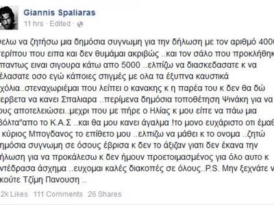 «Δημόσια συγγνώμη» ζήτησε μέσω του λογαριασμού του στο Facebook, ο Γιάννης Σπαλιάρας, μετά τον ντόρο που προκλήθηκε από τη δήλωση του ότι έχει πάει με 4.000 γυναίκες.