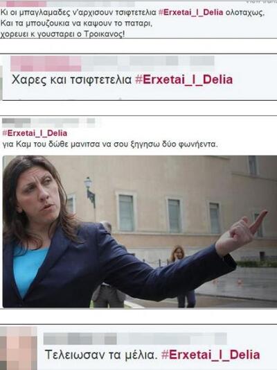 Είναι χαρακτηριστικό ότι το hashtag #Erxetai_I_Delia βρίσκεται στην κορυφή των trends στο twitter με τους χρήστες να δίνουν... ρεσιτάλ!