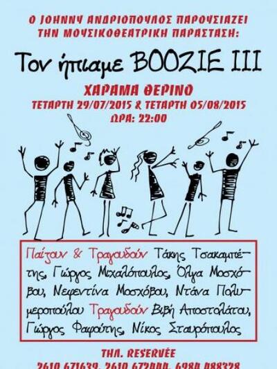 Έρχονται για δεύτερη φορά αύριο Τετάρτη 5 Αυγούστου στο θερινό Χάραμα οι boozie, η ομάδα γνωστών Πατρινών, με την νέα τους παράσταση "τον ήπιαμε boozie". Πρόκειται για μια μουσικοθεατρική παράσταση πού περιέχει 45 λεπτά πρόζα και τραγούδι με κεφάτη προσέγγιση των όσων συμβαίνουν σήμερα και ακολουθεί ένα 3ωρο ξεχωριστό τραγουδιστικό πρόγραμμα με αγαπημένα τραγούδια πού συνήθως δεν παίζονται "στα μπουζούκια".