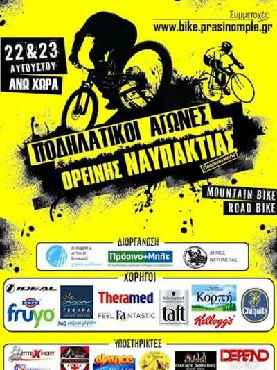 Στη προσπάθεια ανάδειξης της φυσικής και περιβαλλοντικής ομορφιάς της Ορεινής Ναυπακτίας, η περιβαλλοντική οργάνωση «Πράσινο+Μπλε» σε συνεργασία με τον Δήμο Ναυπακτίας και την Περιφέρεια Δυτικής Ελλάδας , διοργανώνουν για 5η συνεχόμενη φορά τους Ποδηλατικούς Αγώνες Ορεινής Ναυπακτίας, στην Άνω Χώρα, στις 22 και 23 Αυγούστου 2015.