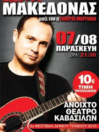 Ο αγαπητός και σημαντικός τραγουδιστής Κώστας Μακεδόνας, πλαισιωμένος από μία εξαιρετική 6μελή ορχήστρα αναμένεται να χαρίσει στο κοινό μία αξέχαστη καλοκαιρινή μουσική βραδιά αυτή την Παρασκευή 7 Αυγούστου 2015 στις 21.30 στα γειτονικά Καβάσιλα του νομού Ηλείας.