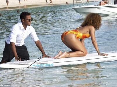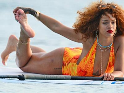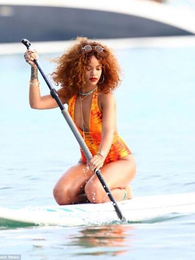 Η Ριάνα φορούσε ολόσωμο μαγιό με βαθιά «κοψίματα», που τόνιζε το στήθος της (και το τατουάζ), αλλά και τους γοφούς -δηλαδή, τα καλλίγραμμα πόδια της- έχοντας τα μαλλιά λυτά και με διακριτικό μέικ απ παραλίας.