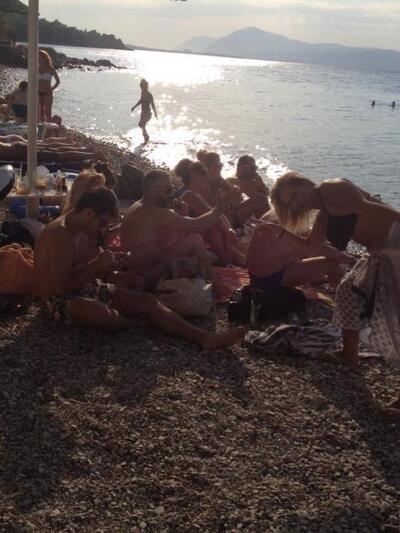 Από τις 6 και μετά πάντως το ενδιαφέρον μετατοπίστηκε στο μπαρ καθώς είχε προγραμματιστεί beach party με τον (κούκλο) dj Νίκο Μοσχοβάκη, εξπέρ στα ελληνικά άσματα. Ολοι γνωρίζονταν μεταξύ τους και το κέφι κορυφώθηκε σε οικογενειακή “ατμόσφαιρα” , το οποίο τονώθηκε μάλιστα (καθοριστικά) από ανδρικό νεανικό μπάτσελορ. Ως τις 11 το βράδυ χοροί, κοκτέιλ, σφηνάκια, “παραγγελιές” κλπ ήταν αδιάκοπα. Νωρίς έκανε γυρίσματα και ο Σπύρος Ματθαιόπουλος του wall tv, με πρώτους-πρώτους στα μικρόφωνα τους Αννα Γιώτη και Θάνο Τσέρη. Χάρης Παναγόπουλος, Τέτη Χαρίτου, Βίκυ Σταυροπούλου, Ζιζή Μπακοπούλου, Τζίνα Φοή, Γεωργία Παπαδοπούλου, Ντίνος Γεωργαράς, Κώστας Σπανός, Ζέτα Αποστολοπούλου,Πάνος Μέξας, Χρήστος Φαλιέρος, Σπύρος Βελέντζας και πολλοί άλλοι διασκέδασαν εκεί. Συγκεντρώσαμε απο το διαδίκτυο κάποια στιγμιότυπα, μόλις συνήλθαμε απο το πολύωρο “ντέρτι” . Α.ΜΠ.