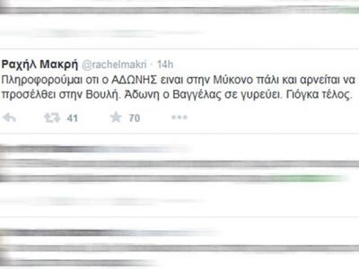 Ανέβασε λοιπόν ένα καυστικό σχόλιο στον προσωπικό της λογαριασμό στο twitter όπου ούτε λίγο ούτε πολύ «τα χώνει» στον Άδωνη.