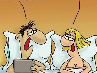 «Διαβάζω το τρίτο μνημόνιο... είναι πολύ σκληρό!» λέει ο άνδρας για να πάρει την απάντηση από την γυναίκα του «εν αντιθέσει με άλλα πράγματα εδώ μέσα!»