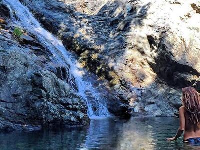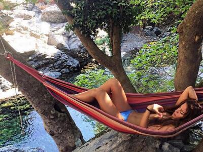Ο λόγος είναι προφανής. Η Συνατσάκη είναι τόπλες απολαμβάνοντας το μπάνιο σε έναν καταρράκτη και χαλαρώνοντας στην αιώρα. «Εδώ μένω εγώ», «Εδώ είναι το σπίτι μου», οι λεζάντες των φωτογραφιών
