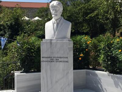 Την προτομή του αείμνηστου Θεόδωρου Γ. Σπυρόπουλου, φιλοτέχνησε ο νέος Καλαβρυτινός γλύπτης, από το γειτονικό χωριό, τον Κλείτορα, Σπύρος Χαραλαμπόπουλος «Κλείτορας», ο οποίος, απέδωσε εκφραστικά, αριστοτεχνικά και καλαίσθητα την εικόνα και την παρουσία του Θεόδωρου Γ. Σπυρόπουλου, ως ενός αγέρωχου, όμορφου και με παράστημα Καλαβρυτινού, όπως πράγματι, ήταν, ο Θεόδωρος Σπυρόπουλος.