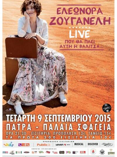 Στην Πάτρα έρχεται Ελεωνόρα Ζουγανέλη για μια μοναδική συναυλία την Τετάρτη 9 Σεπτεμβρίου στα Παλαιά Σφαγεία..Η αγαπημένη καλλίτεχνις με μια βαλίτσα στο χέρι .. ξανασυναντάει τους φίλους της σ' ολόκληρη την Ελλάδα και τη Κύπρο, έχοντας στο ρεπερτόριό της τραγούδια που αγαπάμε !!