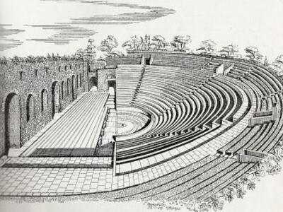 Στα πλαίσια της πολιτικής των Ρωμαίων Αυτοκρατόρων ορθώνεται το Ωδείο σε τύπο ανοιχτού θεάτρου, το οποίο ενώνει την ελληνική ιδέα του κεκλιμένου κοίλου με την ρωμαϊκή ιδέα της βαριά διακοσμημένης σκηνής.