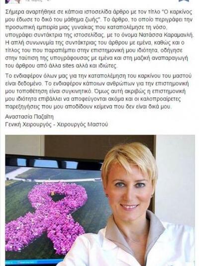 «Σήμερα αναρτήθηκε σε κάποια ιστοσελίδα άρθρο με τον τίτλο "Ο καρκίνος μου έδωσε το δικό του μάθημα ζωής". Το άρθρο, το οποίο περιγράφει την προσωπική εμπειρία μιας γυναίκας που καταπολέμησε τη νόσο, υπογράφει συντάκτρια της ιστοσελίδας, με το όνομα Νατάσσα Καραμανλή. Η απλή συνωνυμία της συντάκτριας του άρθρου με εμένα, καθώς και ο τίτλος του που παραπέμπει στην επιστημονική μου ιδιότητα, οδήγησε στην ταύτιση της υπογράφουσας με εμένα και στη μαζική αναπαραγωγή του άρθρου από άλλα sites αλλά και ιδιώτες.