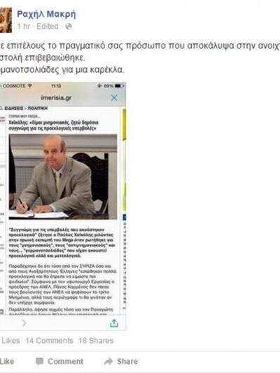 Αυτό είναι το σχόλιο που ανέβασε σήμερα η Ραχήλ Μακρή στον προσωπικό της λογαριασμό στο facebook με αποδέκτη τον Παύλο Χαϊκάλη.