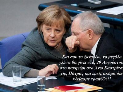 Με μια δική του πρόσκληση στο fb ο πρώην Πρόεδρος του Δημοτικού Συμβουλίου Κώστας Μπουρδούλης καλεί τους Πατρινούς στο πανηγύρι του χωριού του, στο αγαπημένο του Άνω Καστρίτσι. Και επειδή είχε κέφια, είπε να το ρίξει στο πνεύμα της εποχής και να μπλέξει την Μέρκελ και τον Σόιμπλε στη μεγάλη γιορτή της 29ης Αυγούστου.