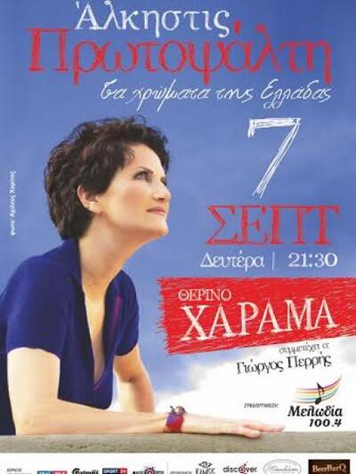 Μετά το «Μetropolitan Museum» της Νέας Υόρκης, το «Catogan theater» στο Λονδίνο, το «Alhambra theater» στο Παρίσι κ.α., η Άλκηστις Πρωτοψάλτη μαζί με τους μουσικούς της συνεργάτες  θα παρουσιάσουν  αυτήν την παράσταση  στην Πάτρα, την Δευτέρα 7 Σεπτεμβρίου στις 9.30 το βράδυ, στο Θερινό ΧΑΡΑΜΑ.